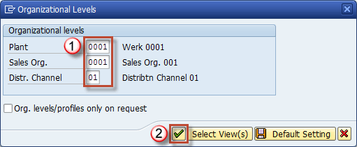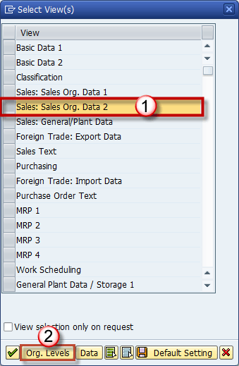 The next step is choosing the views for which data is to be changed. For example, we will choose sales organization data 2 view. You can choose one or more organizational levels for change.